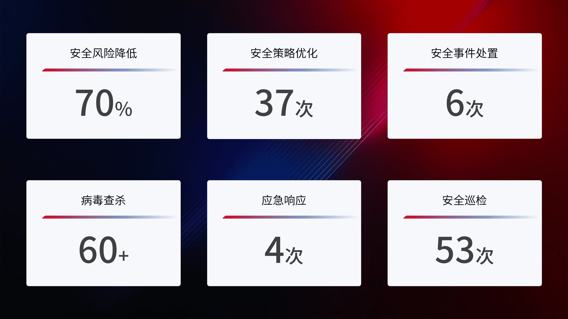 提供全面的安全事件报告体系,,包括处置报告、、、周报、、、季度和年度总结,,结合持续监控,,,,帮助客户深入了解网络安全状况。。